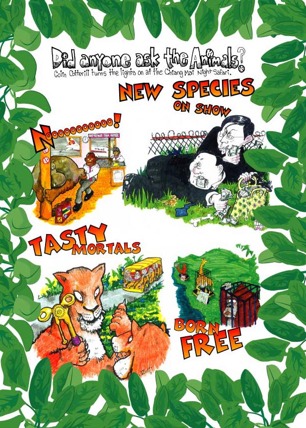 To further illustrate the cartoonist ability of Colin Cotterill here are two drawings he did for Chiang Mai City News back when he lived in Chiang Mai: