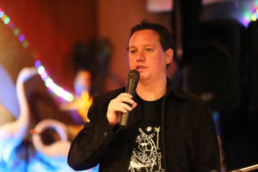 Chris Catto-Smith being his thoughtful self by wearing his Gop T to Night of Noir III at Checkinn99