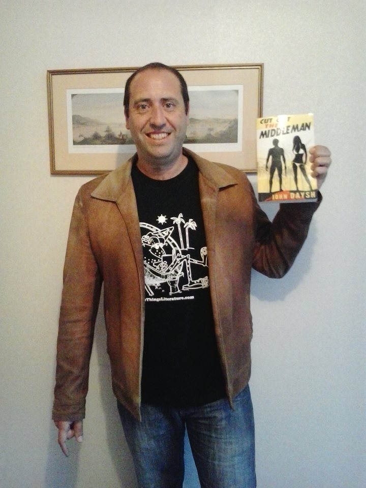 Author John Daysh not realizing I’m the one that’s supposed to be hawking goods here. Looking good in New Zealand leather with his Gop T and his book, Cut Out The Middleman