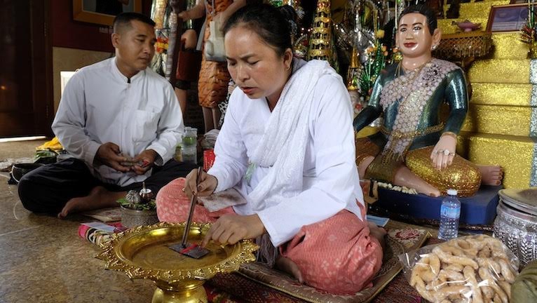 Daun Phann prepares an amulet – A lead plate inscribed with magic