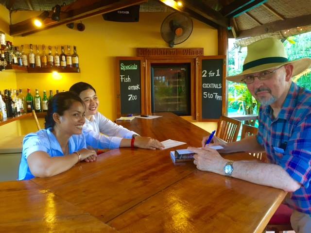 Author and journalist Philip Coggan signing a copy of Spirit Worlds in Kampot
