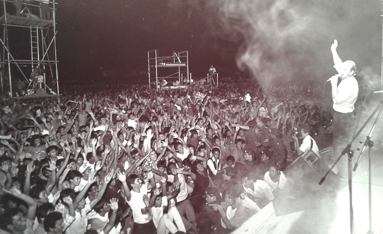 In the mid-80s I was working in Singapore with my English band when my keyboard player and I were approached by a local Chinese/Singaporean drummer to form a band which would include a Filipino female singer and 2 Malay/Singaporean musicians making it the first Eurasian band in Singapore. We accepted the job and almost from the start we became very successful and were voted best group of that year in Singapore (1985). We got a great deal of press, worked on TV and radio and I couldn’t go to the local shop without having to sign an autograph or two on the way, but the biggest moment came when we played the open air Police Academy Concert.